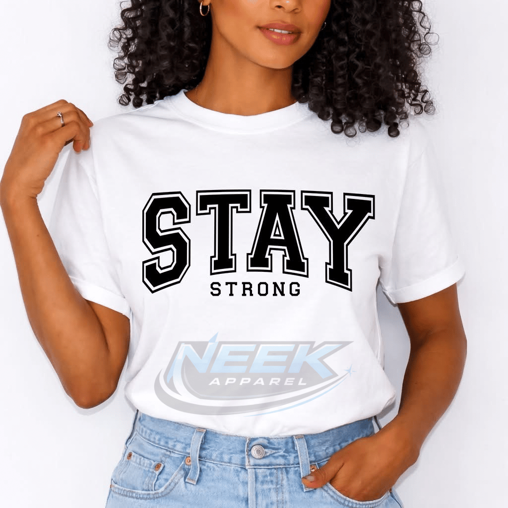 Our Stay Strong graphic tee is designed to inspire resilience, confidence, and everyday empowerment. Featuring bold varsity-style lettering that makes a statement, this classic design blends strength with simplicity for a timeless look.